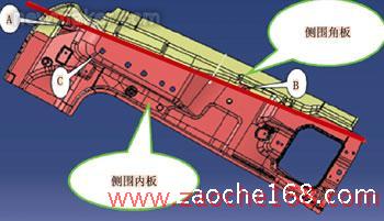 以图5所示的侧围为例,产品最初设计结构为弯曲的折线。以该曲线为焊缝是拼焊技术目前所不能满足的,同时该曲线在图示A/B部位会由于拉延时焊缝的移动造成小孔处可能出现0.75mm、1.6mm两种料厚,这容易导致小孔冲头的弯曲或折断,因而需要重新选择焊缝位置。