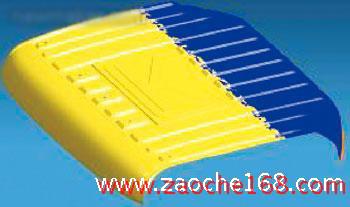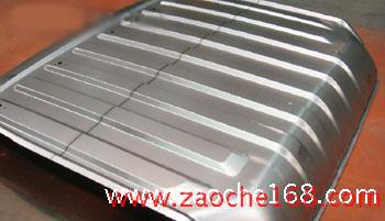 图2所示为东风中型车驾驶室整体顶盖采用激光拼焊板成功进行生产的实例,图3所示为东风重型车分离成形后焊接的顶盖总成示意图。拼焊整体冲压比分件冲压取得了明显的经济效益:模具投资由原先的490万元减少到360万元;减少了设备占用面积和操作人员数量;零件重量由于搭接面的减少而降低了0.55kg,材料利用率达到了相对最高的76.8%,材料消耗减少了5.33kg/辆。