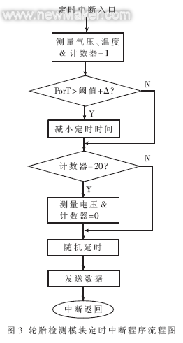 轮胎监测模块的主程序在执行完初始化功能后便根据当前气压值与报警阈值的差值设置定时中断时间,然后进入低功耗模式。模块供电电压、轮胎气压和温度的监测与数据的传输都放置在中断程序,中断结束立即进入低功耗模式。NPX-C10746内置中断定时时间大约为0.5秒~4秒,轮胎气压和温度正常时,可取3秒定时中断一次,调用NPX的轮胎气压和温度检测与补偿、CRC-16校验计算执行库后,通过无线方式发送给主机显示模块。在气压及温度接近或低于报警阈值时,缩短定时中断时间,增加数据采样及发送频率。因为监测模块供电电压下降相对比较缓慢,这里采用软件计数定时中断来延长其检测周期,取20次中断(60秒)采样一次。定时中断程序流程如图3所示。