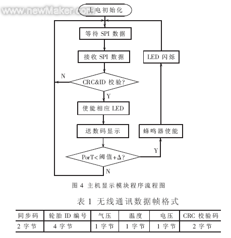 主机上电后,P89LPC930初始化,配置完MC33594后,模块进入等待SPI数据工作状态。在接收到一个数据帧并经CRC校验(采用查表法实现,减小MCU占用时间)和轮胎ID判断无误后,送数码显示并点亮相应的指示灯以表示各模块工作正常。当轮胎监测模块供电电压、气压及温度接近或低于报警阈值时,主机启动LED闪烁警告或蜂鸣器报警。程序流程图如图4所示。