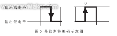 系统的无线通信载波频率选用433.92MHz,发射速率取9600 bps,采用FSK调制方式。发射前先对数据帧进行曼彻斯特编码。曼彻斯特编码(如图5所示)就是用两个bit之间的电平变化来表示数字信号0或1。由高电平变为低电平表示数字0,反之则表示数字1。通过曼彻斯特编码可以减小发射信号的直流分量,降低误码率,提高通信距离。