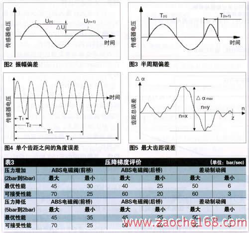 (3)在轮速大于30r/min时,传感器电压必须>0.20V,最大感应电压与最小感应电压的比值应≤2.0,否则ABS不工作,ABS警告灯会亮。