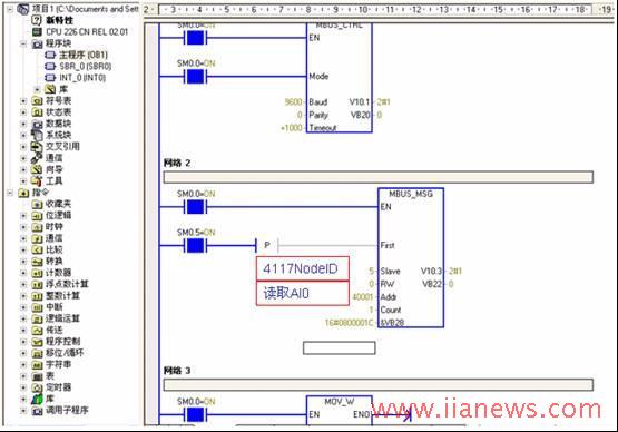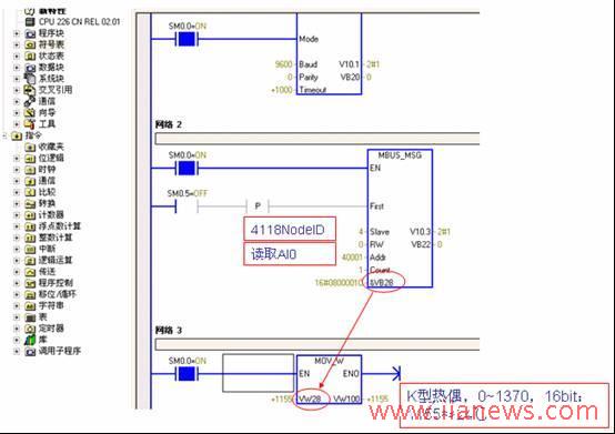 4、将PLC S7-200和ADAM-4117硬件连接如上图所示,并在PLC中编程如下,即可将ADAM-4117的第0通道(Modbus地址为40001)的值读出,如下所示: