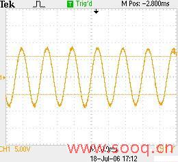 台达B、V系列均具有高频输出的功能,通过其高频输出直接来给变压器供电。从而简化了臭氧电源电路的设计,以及其完善的保护措施保证了这个系统的可靠性和稳定性。同时由于其完善的控制算法,在高频输出时保证了电流的稳定。下图是在变频器的输出端无电抗器,变压器工作在额定频率之上的电流波形。可以根据图形看出,台达变频器在负载冲击比较大的情况下,仍然能够保证电流的平滑性。