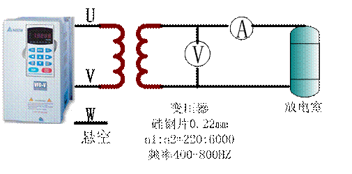 稳定可靠,而且也决定了臭氧合成效率。目前臭氧发生器中电源系统可以根据频率来分:工频电源、中频电源、高频电源。频率在400-1000HZ的电源可以称为中频电源,1000HZ以上可以称为高频电源。电极的工作特性要求与其匹配的供电电源必须具备稳定的输出频率和适当电压峰值,这样才能保证电极高效、可靠地工作。同时,为了使臭氧产量稳定,供电电源的输出功率应该保持恒定。通常臭氧发生器中电源采用电压调节器,结构简单、成本较低。但存在工作频率不稳定、输出电压随输入交流电压波动而变化。采用变频器+变压器的方法不但能够产生需要的恒功率高压电源而且操作方便、性能可靠。台达变频器利用VFD-B或者VFD-V系列的BH版本的高速功能,满足了臭氧发生器电源的要求。在现场中我们需要的变压器的输入端的电压为单相的105V,频率在800HZ.参数如下: