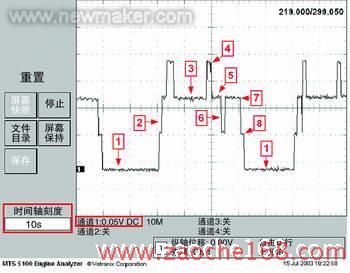 图2中的曲线是我们测出的电磁阀电压波形。注意左下角用红色圈出的参数框,横坐标为时间值,一个大刻度是10s,共分为10个大刻度,所以屏幕能显示100s时间内的曲线。在这段时间内,变速器从4挡开始,逐个挡位转换至停止,然后又逐个挡位转换回到4挡位。纵轴为电压值,一个大刻度为0.05V DC,即50mV。