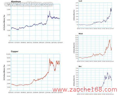 过去两年间的金属平均价格比前5年的价格提高3到4倍。亚洲持续增长的需求让全球供应日趋紧张,金属供应一度由于价格疲软需求缺乏而停滞。至少在短期内似乎已经没有希望,于是迫使人们找寻更加便宜的材料以及更加低成本的制造方法。以下是该形势的曲线图。所有数据来自伦敦金属交易市场。