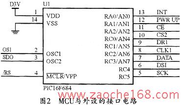 本系统的每个传感器内都有1个MCU芯片PIC16F684。这是一款微功耗高性能单片机。由于其片上集成有晶振电路和复位电路,因此其最小系统极为简单,只要接通电源就可以工作。