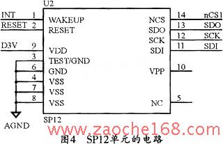 SP12是集成式三合一传感器,它能够把气压、温度、加速度等物理量转换为数值量并发送至MCU。SP12的传感器探头安装在芯片封装上,因此。只需通电就可以通过MCU向SP12发指令以启动采样。SP12的外围电路也很简单,只有电源接口和MCU的数字接口。具体电路参见图4。