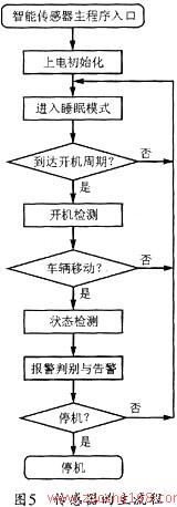 图5所示是该智能传感器的主程序流程。本系统开机后.首先执行上电初始化程序。然后进入睡眠模式以节省电能,当到达定时开机时刻,智能传感器的处理器将被外部中断唤醒,并执行开机检测程序,以在车辆移动时执行检测,否则返回睡眠模式。当系统启动状态检测后,智能传感器依次检测轮胎内的气压、温度等信息。
