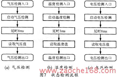 状态检测是该智能传感器的核心功能,主要包括气压检测、温度检测,以及电池电压检测。由于SP12芯片集成了所有气压检测、温度检测及电压检测功能,因此,它们的状态检测程序流程与加速检测基本类似,主要是对SP12的通讯。各种状态检测流程图见图7所示。