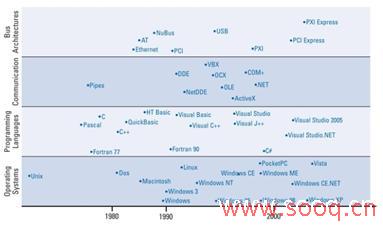 LabVIEW 3.0首次实现了多平台兼容的特性,保证相同的代码可以运行在多个操作系统中;LabVIEW 5则推出了实时(Real Time)模块,允许工程师们将在主机上开发的LabVIEW代码进行自动编译,使其运行在实时硬件对象中。通过降低在实时系统中部署代码的复杂度,这个创新的理念帮助工程师以一种更方便的方式进行控制应用的开发;而LabVIEW 7与FPGA技术的结合则又是该理念的进一步升华,从而让不具备VHDL编程经验的工程师们也同样可以进行硬件设计,并且LabVIEW本质上的数据流并行性非常符合FPGA并行电路特性,在此基础上可以达到很好的空间利用和定时性能;LabVIEW 8.2作为20周年的纪念版,首次推出了中文版,使中国工程师们也能用自己的母语编程,最大程度地提升开发效率;最新的LabVIEW 8.5则更为多核处理器技术提供了强有力的支持,同时也推出了基于UML语言规范的状态图设计模块。综合而言,LabVIEW通过不断地融入最新商业可用技术(图2),让使用者无需花费过多的精力去学习每个技术的细节就可以直接使用,提升了系统的性能,保证了工程师们长期的投资。