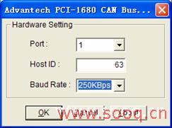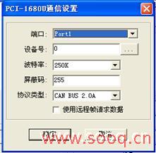 用PCI-1680U板卡的第一个端口接收数据,所以在设备中选择Port1,设备号选择第一个设备,波特率选择250k(和传感器波特率相同),屏蔽码为255。