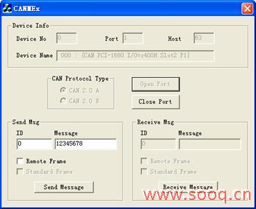 针对研华PCI-1680U板卡,在设备站参数设置中,其端口、设备号可以选择(见图4.2),波特率可以设定,比如Port1,设备号为0,波特率:250K。这些对应Advantech Device Magnager中的HardwareSetting(见图4.3)。其协议类型和远程帧方式对应测试程序中对CAN卡的进一步设置(详见图4.4),其中在安装研华Demo后目录中,如C:\Program Files\Advantech\CAN\CAN Examples\Examples\VC\CanMEx)。