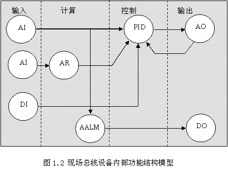 图1.2形象的描述了现场总线设备内部构造。工业自动化领域设备内部结构有规律可循,并可以标准化,为现场总线高层协议设备模型的标准化提供了事实依据和保障。
