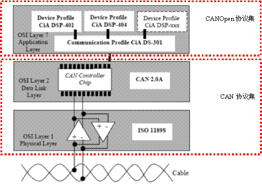基于OSI通讯模型,CAN总线协议仅仅定义了物理层和数据链路层标准,而CANopen协议是在CAN2.0A协议基础上的应用层协议。