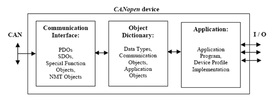 根据自动化现场的要求,CANopen设备下面接入信号I/O,采集现场数据,上部连接CAN总线,向高层传送设备信息。CANopen协议为总线设备定义了应用程序软件、对象字典和CAN-bus通讯,如图2.2说明了三者间的关系。