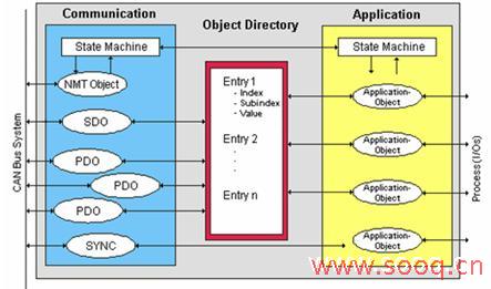图2.2 [1] CANopen设备模型中应用软件、对象字典和通讯部分的关系图