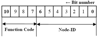 缺省ID分配表是基于11位CAN-ID,包含一个4位的功能码部分和一个7位的节点ID(Node-ID)部分。如图4所示。