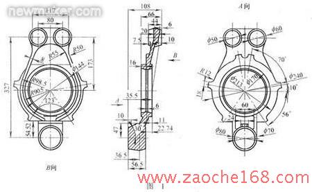 汽车制动板的材料为20Mn,形状复杂,设计要求批量模锻生产,切削加工余量小、强度高。其锻件形状、尺寸见图1。图1中除2个Φ60mm、Φ144mm、Φ70mm内孔及平面需切削加工外,其他都是黑皮表商锻件,不再进行切削加工。