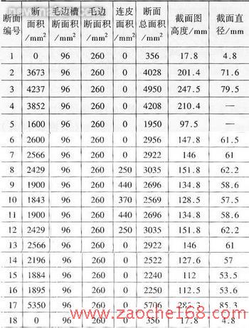 (4)绘制计算毛坯的截面图和直径图 从制动板锻件上,选取18个典型断面,经计算、测绘得出如附表所示的截面数据。为了绘制毛坯的截面图,把锻件各断面总面积换算成高度,进而计算出截面直径。