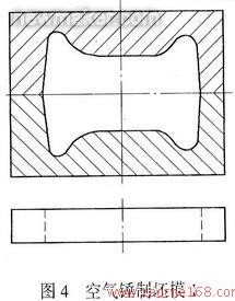 (3)制坯 制坯在750kg空气锤上自由锻制坯。工步复杂,且此工序极为关键,要求分料准确,制坯胎模模具设计精确,不能墨守成规。经过反复探索,确定两套成形胎模和一套冲孔胎模锻造、冲孔,两套成形胎模形状见图4、图5。