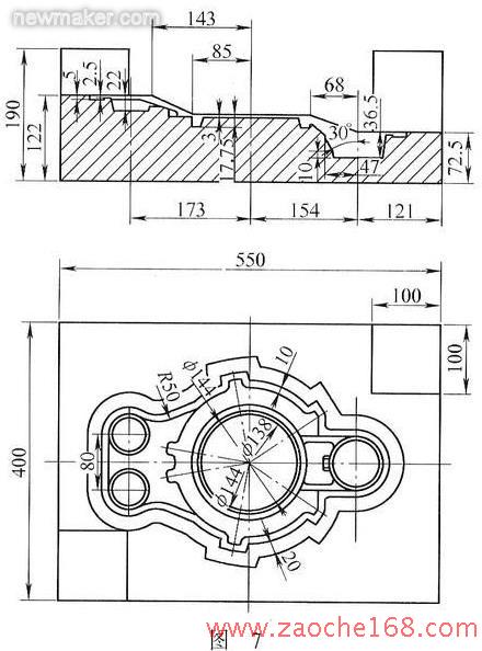 (1)成形模锻模传递动力,迫使金属毛坯成形,承受反复瞬时冲击载荷和冷热交变作用,工作条件繁重,产生应力大。制动板锻件有三个分模面及斜面,模锻过程中易产生水平分力,引起锻模错移,使用对角锁扣来平衡水平错移力。按l%的冷缩率设计模具,采用螺栓、压板紧固。模具采用5CrMnMo材料制造,模具热处理淬火硬度42~46HRC。鉴于制动板零件的低价战略,模具制造时,最大限度地采用车、铣、钻、刨和磨这些低成本普通机加工方法和钳工修磨方法,极少部分采用了电火花加工方法。同时制造两套模具,便于维修更换,不影响生产。模具维修也采用氩弧填焊的方法,做好细节降低成本。成形模形状尺寸见图6、图7。