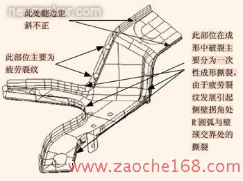 根据现场的实际情况,通过检查制件撕裂部位、断口形态及挤伤程度,认为引起制件撕裂、歪斜行为主要体现在翻边成形工序,引起此工序现象发生的原因如下: