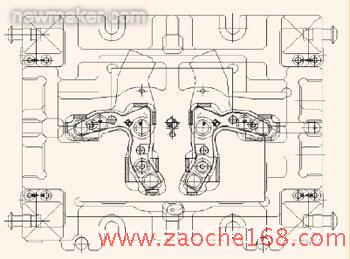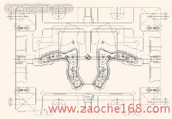 该模具为一模双腔左/右件公用,由于本工序内容除翻边外,还兼备形状成形内容,加之制件特殊复杂,弯曲面狭小,成形要求凹模压料芯与成形面相符等,导致模具结构条件成形行程大,压料面积小。设计人员在最初模具设计时,仅考虑到了压料面小这一特征,却忽视了压料芯成形导滑行程(图2)。