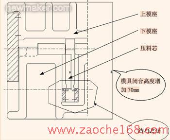 (2)如图6所示,增加模具闭合高度70mm。在模具在成形过程中,当压料芯被托起后,将下方有效导向部位从10mm增加至80mm,这样可以增加压料芯导滑板与凹模侧壁导板之间的接触面积,从而使模具压料芯在运行中不会受到成形力的影响,同时也能准确、稳定地导入凹模腔,保证制件定位可靠,确保翻边间隙均匀化。