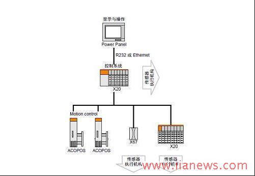 统(如X20)的数据通信,帧驱动灵活的编程以及以太网接口确保与任何控制系统的连接,控制器则通过POWERLINK或其它现场总线实现与X20远程I/O和运动控制伺服驱动器ACOPOS的连接,构成Panel-based控制系统。其硬件配置如表2所示。