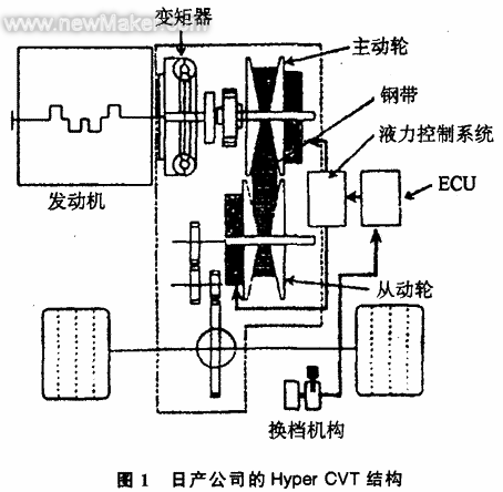 1997年上半年,日本日产公司开发了使用在2.0L汽车上的CVT。在此基础上,日产公司在1998年开发了一种为中型轿车设计的包含一个手动换档模式的CVT。新型CVT采用一个最新研制的高强度宽钢带和一个高液压控制系统。通过采用这些先进的技术来获得较大的转矩能力,日产公司研究开发CVT的电子控制技术,传动比的改变实行全档电子控制,汽车在下坡时可以一直根据车速控制发动机制动,而且在湿滑路面上能够平顺地增加速比来防止打滑。日产公司计划将它的CVT的应用范围从1.0 L扩大到3.0L的轿车。