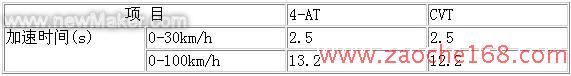 汽车的后备功率决定了汽车的爬坡能力和加速能力。汽车的后备功率愈大,汽车的动力性愈好。由于CVT的无级变速特性,能够获得后备功率最大的传动比,所以CVT的动力性能明显优于机械变速器(MT)和自动变速器(AT)。表2为分别安装4-AT和CVT的克莱斯勒的Voyager轿车的动力性比较,安装CVT的汽车拥有更佳的动力性能。