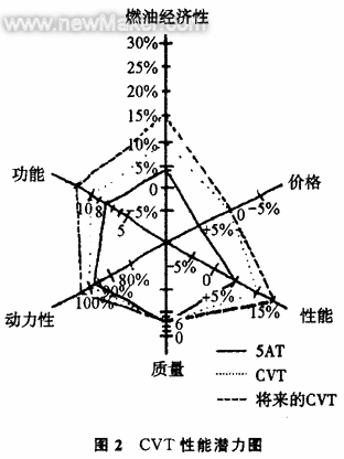 在最近的十几年中,CVT技术已经向前迈进了一大步,使得CVT比有着超过100年历史的机械变速器(MT)和有着超过50年历史的自动变速器(AT)更有竞争力。CVT技术正处在寿命周期的开始,CVT的特性将进一步提高,图2显示出CVT的未来潜力。