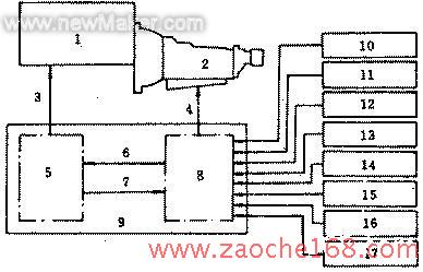 1-发动机;2-自动变速器;3-发动机控制信号;4-变速控制信号;5-发动机控制用微机6-发动机控制信号;7-发动机转速状态控制信号;8-变速控制用微机;9-发动机与变速控制单元ECU;10-节气门位置传感器;11-速度传感器(在变速器内);12-速度传感器(在速度表内);13-水温开关;14-变速方式选择开关;15-空挡启动开关;16-停车灯开关;17-变速控制开关