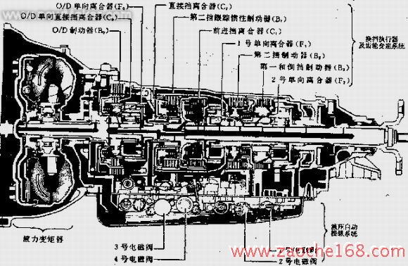 电子控制自动变速器通常由液力变矩器、行星齿轮变速系统、换挡执行器、液压自动操纵系统、电子控制系统五部分组成,图2-1所示为典型的汽车四挡自动变速器结构图。
