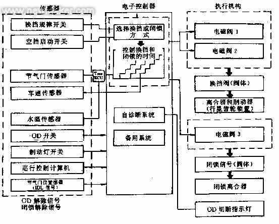 电子控制系统由传感器、电子控制器和执行机构三部分组成,图2-5是丰田A140E四挡自动变速器的电控系统方框图。