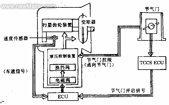 电子控制自动变速器(ECT)的控制原理如图3-1所示,它与液控液动(液压控制) 自动变速器控制原理(图3-2)比较有明显不同。
