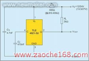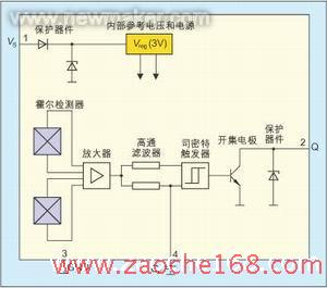 如图1所示,一个施密特触发器用来对该信号进行数字化,一个开集电极输出电路提供输出信号。芯片上还集成了过压保护、反极性保护和抗电磁干扰功能,因而可以应用在汽车中常见的恶劣环境。
