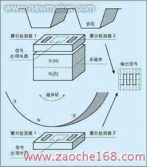 当该霍尔器件处在任何极性的恒定磁场中时,其上的两个霍尔传感器将产生同样的输出信号。无论该磁场的绝对强度有多大,它们之间的差值总为零。然而,由于一个单元面向磁场集中的轮齿,另一个单元则面向一个齿隙,如果两个霍尔单元之间存在磁场梯度,那么将产生一个差值信号,并在芯片上放大。实际上,这个差值体现了一个小偏移,它可由相应集成的控制机制来修正。这种动态差分原理使传感器表面与齿轮之间存在较大气隙的条件下能保持高灵敏度。