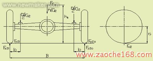 2)当侧向力最大时,外轮和内轮上的垂直反力和Fz2o,Fz2i以及桥壳内、外板簧座处断面的弯曲应力σi、σo之间的关系,分别为: