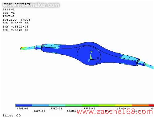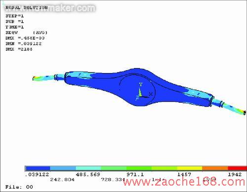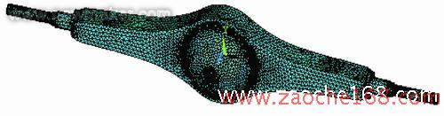 上述桥壳强度的传统计算方法,只能算出某一断面的应力平均值,而不能完全反映桥壳上应力及其分布的真实情况。因此,它仅用于对桥壳强度的验算,或用作与其他车型的桥壳强度进行比较,而不能用于计算桥壳上某点(例如应力集中点)的真实应力值。使用有限元法对驱动桥壳进行强度分析,只要计算模型简化得当,受力约束处理合理,就可以得到比较详细的应力与变形的分布情况,这些都是上述传统计算方法所难以办到的。