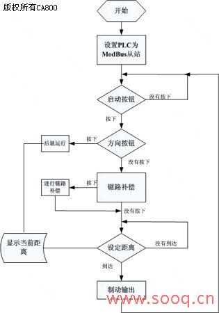 ![]() 摘 要:将HOLLiAS LM小型PLC应用于木工带锯机的控制,并给出了PLC端子接线图和控制系统流程图。 关键词:PLC;木工带锯机 在木工机械中,例如木工带锯机,往往通过PLC或单片机来控制送料部分进行自动运行。由于单片机控制系统的抗干扰能力差,容易产生误动作和误数据,使操作人员判断错误,从而误操作。而PLC具备良好的抗干扰性和通用性,从而解决了这一问题。 1 . 木工带锯机的工作原理 用来锯切原木或成材的木工机床分为木工带锯机﹑木工圆锯机和木工框锯机等。所谓木工带锯机是环状带锯条张紧在两个锯轮上,环状带锯条由电动机通过锯轮带动,作连续切削运动。木料的进给可以采用手动,也可以采用跑车或滚筒进行自动进给。按照用途分类,带锯机可以分为锯切原木的跑车带锯机和剖分板材或方材的再剖带锯机。 本项目所使用的带锯机为跑车带锯机。所谓跑车,是指夹持原木向带锯条作进给运动的送材车。PLC需要完成的动作是对跑车进行定位控制。跑车的动力设备是装配在底盘上的电动机,经过齿轮传动,带动跑车的主轴进行往复运动。跑车前进为工作行程,跑车后退为返回行程。其工作过程是,首先跑车工作台以一定的速度运行一段距离,当系统再次收到前进指令时,又以同样的速度运行同样的距离,并且此距离可以被修改。当系统收到后退指令时,进行返回行程,直到此指令被取消。电动机的正转和反转控制跑车工作台的前进和后退。通过PLC控制系统实现对电动机方向的控制。 2 . PLC选型与I/O点分配 为了保证系统的控制精度,跑车带锯机控制系统采用闭环控制。根据旋转编码器反馈回来的脉冲信号计算跑车工作台的实际距离。当跑车工作台到达设定距离后,PLC输出制动信号,停止跑车的运行,实现跑车的定位。PLC控制系统需要配置1路高速脉冲信号输入。跑车工作台还需要1个定点位置来进行进尺和余尺的计算,可以利用安装在跑车支架上的接近开关确定跑车经过的定点位置,因此系统还需要配置1个接近开关输入点。最后,系统还需要配置启动、停止、进车、退车、点动等按钮。因此,系统的开关量输入点为8个。系统的开关量输出点只有制动接触器和后退继电器等2个点,分别控制跑车的停止和跑车运动的方向。PLC控制系统的I/O点分配如表1所示。 综上所述,根据输入和输出的要求,我们选用和利时公司具有自主知识产权的HOLLiAS LM小型PLC。考虑到此系统需要一定的备用I/O点,CPU模块选择带有24点开关量的LM3107,其中开关量输入14点,开关量输出10点。CPU模块LM3107自带3路独立的高速脉冲输入,其继电器输出的电流容量最大为2A,可以直接控制制动接触器,不需要中间继电器。这些配置完全能够满足系统的要求。 表1 PLC控制系统的I/O点分配 3 . PLC控制系统软件设计 跑车工作台运行的启动、停止开关SB1、SB2分别接到PLC的输入端口%IX0.1和%IX0.2。当启动开关SB1接通时,跑车工作台启动运行。当停止开关SB2闭合时,跑车工作台停止运行。旋转编码器产生的脉冲信号接到内部计数器HD_CTUD_T4的输入端口%IX0.4和%IX0.5。利用PLC计数器HD_CTUD_T4的脉冲计数功能,控制系统可以定位跑车工作台当前的运行距离,将当前距离与设定距离进行比较,从而控制工作台的进给位置。PLC的输出端口%QX0.0接制动接触器,用来控制跑车工作台运行和停止。当%QX0.0=0时,电动机正转,带动工作台前进。当%QX0.0=1时,电动机反转,带动工作台后退。 根据跑车工作台运行过程的要求,控制系统的流程图如图1所示。PLC根据HD_CTUD_T4的当前脉冲值和触摸屏的设定值进行比较。如果当前值小于设定值,跑车工作台继续运行。如果当前值大于设定值,系统立即输出制动信号,然后等待下一次前进信号的输入。当系统需要锯路补偿时,程序会根据用户选择的补偿量进行锯路补偿。 ![]() 控制系统的流程图 4 . 结论 以PLC为控制核心的木工带锯机,实现了位置闭环控制。利用PLC的高速计数功能,实现了对跑车工作台运行的定位控制。PLC控制系统的抗干扰能力强,提高了木工带锯机的加工精度。因此,PLC控制系统可以广泛应用于家具﹑门窗和木模等制造行业。 |