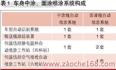 自动喷涂机分别应用在中涂线和面漆线,其系统构成如表1所示。