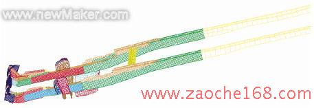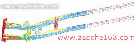 通过模拟计算为试验测试提供参考和方向,在计算机上方便、快捷地进行多方案的分析比较,效率高、成本低。由于风景海狮车架变形情况对碰撞安全性起着决定性的影响,在进行碰撞模拟时,采用了车架的CAD 和CAE 模型来进行计算和分析(图2、图3)。同时,使用IBM 公司提供的并行计算机群系统和ANSYS公司提供的LS-DYNA960 并行计算软件,大大提高了计算效率,确保样车碰撞试验、模拟计算和改进设计同步进行,取得了很好的效果。