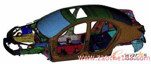 根据企业内部标准,首先利用HyperMesh对白车身各部件进行网格划分,得到白车身的有限元模型,如图1所示。该模型主要由四节点和三节点的壳单元构成,焊点采用ACM方式,部分结构涂胶采用胶粘单元模拟。该模型共有438145个节点,432051个单元。