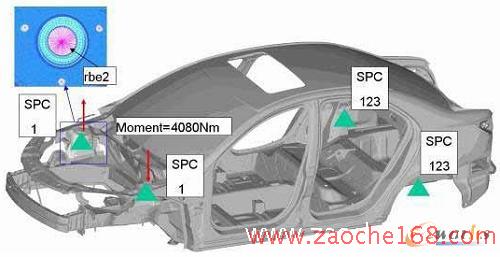 扭转工况的载荷施加在前减震塔中心点上,在垂向施加大小相等方向相反的载荷。载荷的大小通过公式F=M/L求得,其中M为试验要求的扭矩值,L为左右减震塔中心之间的距离。在线性分析中,施加扭矩的大小和最后计算得到的刚度值无关,但是为了和试验中测点的位移作对比,分析中施加的扭矩大小应该和试验的相同,故分析中施加的扭矩为4080Nm,如图3所示。
