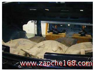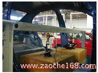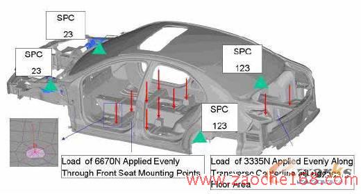 中部加载工况:在前排座椅安装点处共施加6670N载荷。试验时将木块置于前排座椅安装点上,然后在木块上进行加载,如图4所示;在有限元模型中,将6670N均布在前排座椅安装点处,如图5所示。