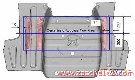 后部中间加载工况:在行李箱中部加载3335N。试验时将木板横放在行李箱中部地板上,木板边缘与车身内壁的距离为70mm,木板的宽度为400mm,然后在木板上进行加载,如图6所示;有限元模型中的实现方式为,将载荷3335N均布在图7所示的矩形区域内(不包括模型中下凹部分),矩形的尺寸和位置按照试验中木板的尺寸和位置来确定。