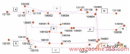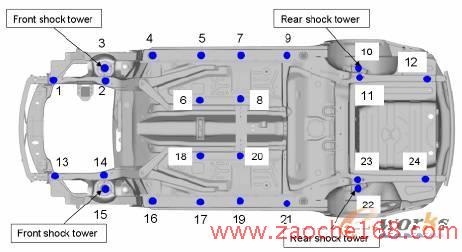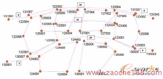 试验中在车身底部布置测点,测点的布置方式如图8所示。为了考察车身的总体刚度情况,并能更准确地与试验结果作对比,在白车身上共选取320个点,作为Z向相对位移的结果输出,然后求得刚度值。车身各部件上选取的输出点按特定的节点号排列。为了方便观察选取点的位移情况,在选取点之间创建PLOTEL单元,如图9、图10所示,图中方框中的数字代表两节点之间均布的节点数。